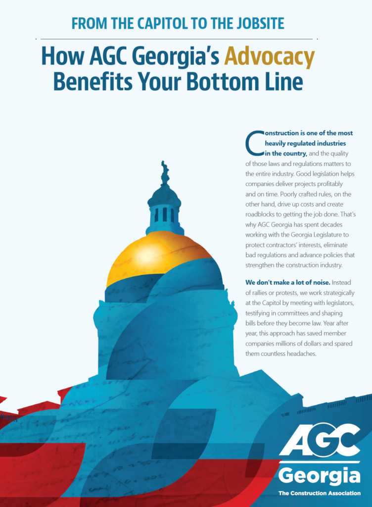 AGC Georgia is the trusted voice of Georgia’s commercial construction industry. Through strong relationships with elected and appointed state officials, agency leaders, and policymakers, we ensure the perspectives and priorities of our members are front and center in key decisions affecting our industry. At the national level, AGC of America amplifies this voice by representing over 27,000 member firms across 87 chapters through experienced, respected advocacy professionals working on Capitol Hill.